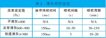 后級布袋除塵控制系統(tǒng)主要是控制布袋的清灰和提升閥的動作,其工作方式可選擇在線清灰、離線清灰、定時清灰、定壓清灰。在觸摸屏上設(shè)有自動、手動等轉(zhuǎn)換方式開關(guān),設(shè)在自動時人機(jī)界面操作終端上每個分室可單獨(dú)設(shè)投入/退出。壓差信號上下設(shè)定值可調(diào),電磁脈沖閥以矩陣控制輸出,在任何時候,不允許兩個及兩個以上的脈沖電磁閥工作。表2 為清灰狀態(tài)設(shè)定值。