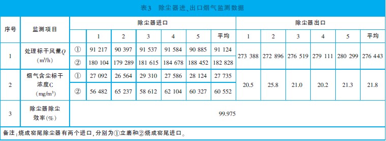 該系統(tǒng)于2008 年8 月竣工并投入運(yùn)行,2008 年 12 月9 日,該廠組織環(huán)保驗(yàn)收,測試結(jié)果為除塵器出口排放濃度平均21.8mg/Nm3 見表3, 阻力850Pa,達(dá)到設(shè)計(jì)要求。