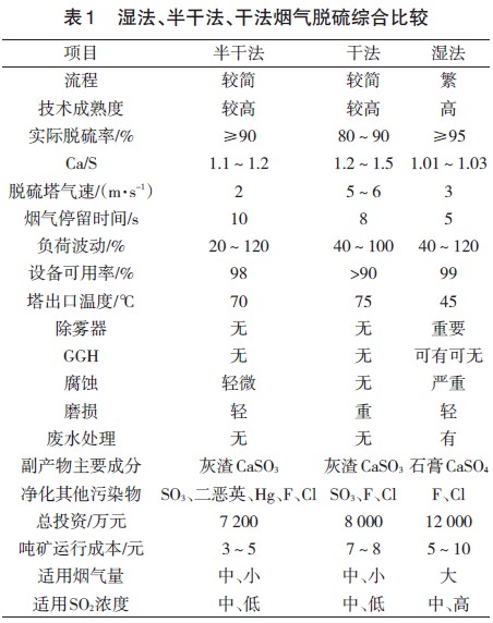 目前有關(guān)燒結(jié)機煙氣脫硫的技術(shù)主要有干法、半干法和濕法等脫硫形式。近年來,我國鋼鐵企業(yè)建設(shè)了一些不同技術(shù)流程的燒結(jié)機煙氣脫硫項目,各種脫硫技術(shù)在鋼鐵企業(yè)都有不同程度的應用。從已經(jīng)投產(chǎn)的燒結(jié)機煙氣脫硫項目來看,雖然取得了一定的成果和經(jīng)驗,但并沒有完全解決燒結(jié)機煙氣脫硫技術(shù)問題,大多數(shù)是以昂貴的投資和運行成本為代價,而且一些脫硫設(shè)施運行不穩(wěn)定、設(shè)備腐蝕嚴重,產(chǎn)生的副產(chǎn)物難以處理,對環(huán)境造成二次污染。下面以燒結(jié)機煙氣脫硫為例,濕法、半干法、干法3 種技術(shù)的綜合比較見表1。