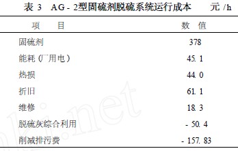 應(yīng)用AG - 2型固硫劑脫硫技術(shù)的系統(tǒng)能耗為 200 ( kW·h) /h,僅為其他脫硫技術(shù)的1 /4~1 /2,也就是說,應(yīng)用AG - 2型固硫劑脫硫技術(shù)所造成的鍋爐熱效率損失和脫硫系統(tǒng)能耗之和,仍比其他脫硫技術(shù)的能耗小得多。