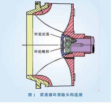 脫硫系統(tǒng)試運(yùn)通過(guò)后,2 套脫硫裝置6 臺(tái)漿液 循環(huán)泵頻繁發(fā)生循環(huán)泵葉輪螺栓斷裂故障, 造成葉 輪封蓋脫出,葉輪脫開(kāi),循環(huán)泵卡死,導(dǎo)致機(jī)組無(wú)法 運(yùn)行。機(jī)組運(yùn)行4 個(gè)月,6 臺(tái)泵相繼出現(xiàn)同樣故障,其中1 臺(tái)僅運(yùn)行半個(gè)月, 嚴(yán)重影響了脫硫系統(tǒng)正常 運(yùn)行。漿液循環(huán)泵軸頭構(gòu)造見(jiàn)圖1 所示。1 號(hào)脫硫系 統(tǒng)3 臺(tái)漿液循環(huán)泵運(yùn)行的主要參數(shù)見(jiàn)表2。