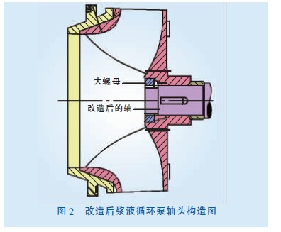 由于吸收塔漿液循環(huán)泵故障的主要原因是循環(huán) 泵葉輪螺栓斷裂,故改用高強(qiáng)度螺栓;但使用不久再 次發(fā)生同樣事故。經(jīng)研究,決定對(duì)泵軸頭結(jié)構(gòu)進(jìn)行改 造,改造措施如下(改造后漿液循環(huán)泵軸頭構(gòu)造圖見(jiàn) 圖2 所示):
