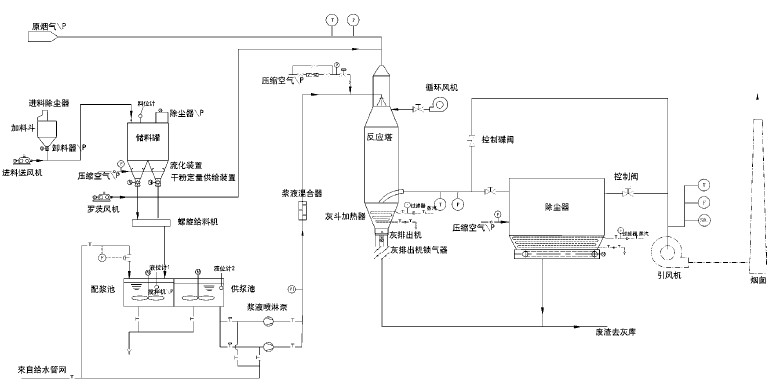 噴霧干燥法尾氣脫酸裝置主要由石灰漿制備系統(tǒng)、石灰漿噴入系統(tǒng)、活性炭噴入系統(tǒng)、脫酸系統(tǒng)、回風(fēng)系統(tǒng)、粉塵收集系統(tǒng)、廢渣排出系統(tǒng)、控制系統(tǒng)組成。