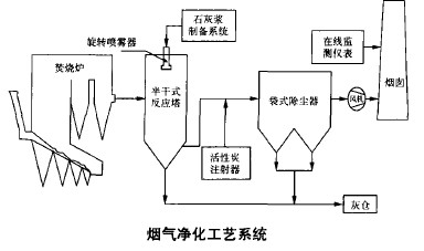 比利時(shí)西格斯公司設(shè)計(jì)的煙氣處理系統(tǒng)為半干式吸收塔+活性炭噴人系統(tǒng)+袋式除塵器的組合工藝, 其工藝系統(tǒng)如下圖所示。