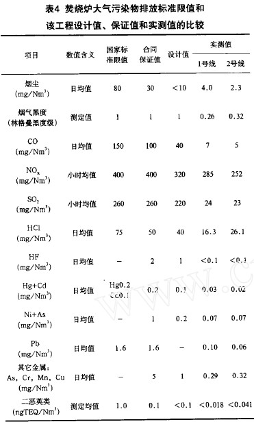 該垃圾焚燒發(fā)電廠的環(huán)保指標(biāo)與國(guó)標(biāo)GB18485-2001 和實(shí)測(cè)值的比較見(jiàn)表1。由表1可以看出, 排放煙氣中的主要污染物、酸性氣體和重金屬的實(shí)測(cè)數(shù)值都符合國(guó)家規(guī)定的限值。