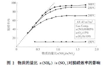 物質的量比n (NH3 ) / n (NOx )對脫硝效率的影響如圖2所示(由廠家提供) 。