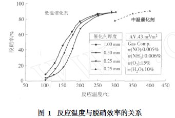 反應溫度對脫硝率有較大的影響,從廠家給出的反應曲線(如圖1所示)可以看出,在300~400 ℃ 內(對中溫觸媒) ,隨著反應溫度的升高,脫硝率逐漸增加,升至400 ℃時,達到最大值( 90% ) ,隨后脫硝率隨溫度的升高而下降。這主要是由于在SCR 過程中溫度的影響存在2種趨勢:一方面溫度升高時脫硝反應速率增加,脫硝率升高;另一方面隨溫度升高,NH3 氧化反應加劇,使脫硝率下降。因此,最佳溫度是這2種趨勢對立統(tǒng)一的結果。