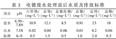 (5)污泥處理。濃縮池內(nèi)污泥經(jīng)板框壓濾機(jī)脫水,風(fēng)干后出售給廣東某金屬冶煉廠對(duì)污泥中貴重金屬進(jìn)行提煉,使污泥作為下游產(chǎn)業(yè)的原料有效利用,經(jīng)檢測(cè)污泥中主要重金屬質(zhì)量分?jǐn)?shù)(g/kg):總鉻6.28、總鎳2.21、總銅9.48。濃縮池上清液則回流至含鉻廢水調(diào)節(jié)池,進(jìn)入下一批次處理。