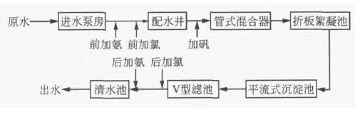 由于杭州市供水管網(wǎng)較長,如采用單氯消毒,因單氯在水中容易揮發(fā),即使出廠水余氯含量較高,管網(wǎng)末梢余氯也會出現(xiàn)小于國家飲用水標準0.05mg/L的情況,因此我們采用氯胺的消毒方式,降低氯消毒副產(chǎn)物,減少單氯消毒時氯的損耗,維持管網(wǎng)中的持續(xù)消毒能力。前加氯、加氨點位于進水泵房后,前加氨量根據(jù)原水氨氮含量控制,當原水氨氮高于0.5mg/L時,停止前加氨;后加氯、加氨點位于濾池后,投加量根據(jù)出廠水水質(zhì)要求控制,由于我廠出水至用戶的輸水管網(wǎng)較長,出廠水余氯控制在1.0~1.8mg/L,氨氮0.3mg/L左右,總的加氯量一般為2.8mg/L左右。具體的氯、氨投加點如圖1。