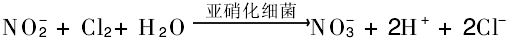夏季高溫時,在錢塘江原水有機物、氨氮含量高的條件下,在水廠V型濾池的砂層中會滋生、積累大量亞硝化細菌,在亞硝化細菌的作用下濾后產(chǎn)生較高的亞硝酸鹽,會與水中的余氯發(fā)生氧化還原反應,方程式如下: