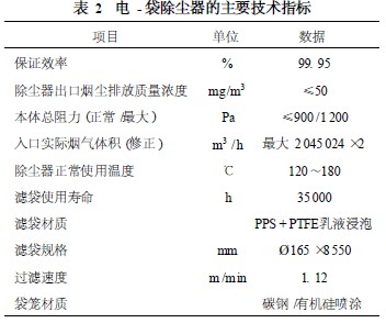 為了提高除塵效率、減少煙塵排放量,華電新鄉(xiāng)發(fā)電有限公司外委對# 1機(jī)組2 臺(tái)電除塵器進(jìn)行了技術(shù)改造,改造后的除塵器采用電除塵器+布袋除塵器組合的電- 袋除塵器,其主要技術(shù)指標(biāo)見表2。