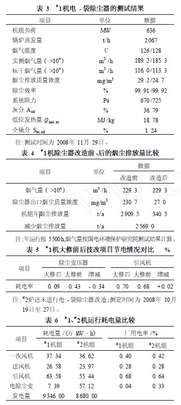 # 1機(jī)組電- 袋除塵器改造工程于2008年5月 26日開工, 2008年7月25日完工, 2008年8月7日隨# 1機(jī)組一起投入運(yùn)行。為了掌握該電- 袋除塵器的運(yùn)行狀況,華電新鄉(xiāng)發(fā)電有限公司委托相關(guān)單位進(jìn)行了該除塵器的性能測試,測試的主要結(jié)果見表3。電- 袋除塵器改造前、后煙塵排放量對比見表4;電- 袋除塵器改造前、后電除塵器及引風(fēng)機(jī)的運(yùn)行電耗進(jìn)行了統(tǒng)計(jì)(某一個(gè)月份) ,統(tǒng)計(jì)結(jié)果見表 5; # 1、# 2機(jī)運(yùn)行電耗比較見表6。