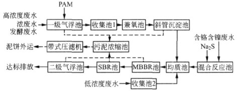 摘要:某醫(yī)藥化工廠生產(chǎn)廢水p H 低﹑ CODCr 高﹑成分復(fù)雜,采用一級(jí)氣浮—兼氧—MBBR —SBR —二級(jí)氣浮出水工藝對(duì)其進(jìn)行處理。工程實(shí)踐表明,出水CODCr < 400 mg/ L ,達(dá)到《污水排入城市下水道水質(zhì)標(biāo)準(zhǔn)》(CJ 3082 —1999) 要求。MBBR 工藝具有良好的脫氮除磷效果。