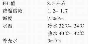 考慮到補(bǔ)充水暫硬高及阻垢劑實(shí)驗(yàn)室試驗(yàn)的 論,該系統(tǒng)的濃縮倍數(shù)按1.5控制。這樣補(bǔ)充水量為 3.0m3/h,聚馬來酸酐投加量為192克/天(產(chǎn)品), ATMP投加量為384克/天(按循環(huán)水中4mg/l藥品 計(jì))。 藥品用投藥槽配成約1‰的溶液,借重力流入冷 水池內(nèi)。補(bǔ)充水通過轉(zhuǎn)子流量計(jì)進(jìn)入水池,循環(huán)水維 持自然平衡PH值,約8.50左右,循環(huán)水內(nèi)不加酸。 循環(huán)水系統(tǒng)控制下列參數(shù):