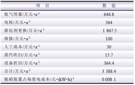 SCR 脫硝裝置運(yùn)行損耗主要是氨氣用量、電耗、催化劑更換、維修、人工成本、設(shè)備折舊等, 這些損耗費(fèi)用按年運(yùn)行7 000 h 估算如表2 所示。