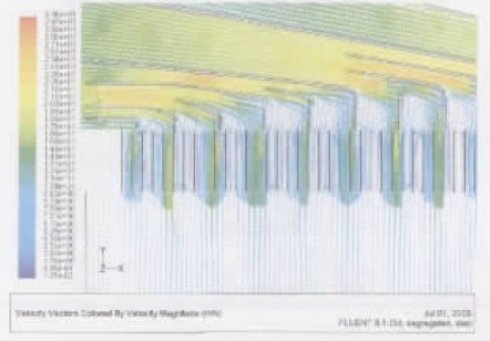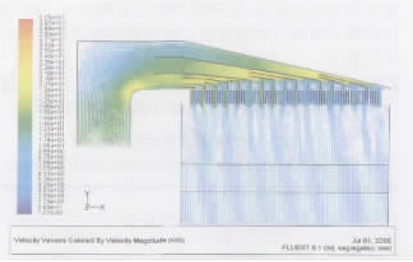 圖3 改變進(jìn)口導(dǎo)流板的數(shù)量和進(jìn)口均流器高度后脫硝反應(yīng)器入口流態(tài)數(shù)學(xué)模型 |