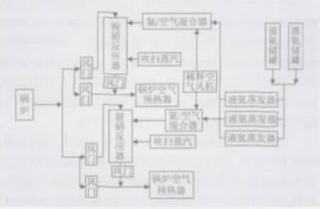 脫硝用的氨氣是由液氨儲存罐中液氨經(jīng)加熱蒸發(fā)產(chǎn)生的濃氨氣, 與稀釋空氣風(fēng)機(jī)送來的風(fēng)在混合器中稀釋混合后, 噴入脫硝反應(yīng)器。