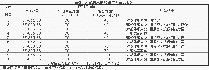 2   污泥脫水藥劑的選擇和對(duì)比試驗(yàn)