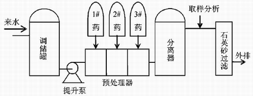 現(xiàn)場(chǎng)中試流程為:來水先進(jìn)入一個(gè)簡(jiǎn)易的調(diào)儲(chǔ)罐,再經(jīng)一個(gè)小的提升泵進(jìn)入預(yù)處理器;在預(yù)處理器中,來水依次和3種藥劑進(jìn)行反應(yīng),充分反應(yīng)后的來水再進(jìn)入分離器;在分離器中,水和污泥實(shí)現(xiàn)分離,分離后的水經(jīng)一次石英砂過濾后排放掉,F(xiàn)場(chǎng)中試流程示意圖如圖1所示。試驗(yàn)中,在不同時(shí)刻從分離器的出口處取水樣進(jìn)行分析,主要分析其中固體懸浮物的含量。