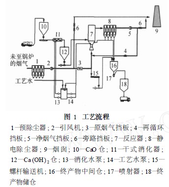 攜帶大量吸收劑和再循環(huán)產(chǎn)物的煙氣從反應(yīng)器頂部排出,進入靜電除塵器,進行氣固分離。靜電除塵器入口煙氣含塵量高達1 000 g·m- 3 ,經(jīng)過靜電除塵器凈化后煙氣含塵量不超過50 mg·m- 3。靜電除塵器收集下來的灰中含有大量未反應(yīng)的吸收劑,因此將大部分收集到的灰返回反應(yīng)器進一步反應(yīng),一小部分灰作為脫硫副產(chǎn)品排至終產(chǎn)物儲倉,再通過罐車外排。經(jīng)過靜電除塵器凈化后的煙氣經(jīng)增壓風(fēng)機和出口擋板門后排入煙囪。工藝流程如圖1所示。各個子系統(tǒng)的詳細描述見文獻[1 ]。