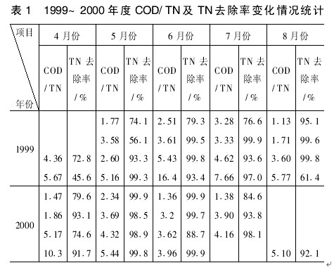 從表1可以看出,盡管隨著COD/TN增大,總氮的去除率也相應(yīng)提高,但是總的說來,COD/TN對北廠脫氮效果的影響較小,同時由于其它因素的影響,在COD/TN大于4時也存在總氮去除率較低的情況,說明COD/TN不是影響脫氮效果的唯一因素。據(jù)有關(guān)資料顯示,當(dāng)COD/TP>60時,總磷的去除率幾乎與碳氮比無關(guān)而保持恒定。北廠進水總磷很低(在0•046~2•9 mg/L之間),COD/TP一般大于60,因此COD/TP對北廠除磷效果的影響較小。