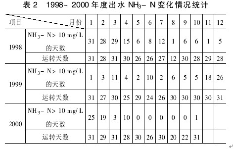 北廠進水NH3-N及TN濃度變化較小,混合液懸浮固體濃度一般控制在4~6 mg/L之間,因此可以近似地看作氮負(fù)荷是隨著污水流量Q變化而變化的參數(shù)。由于各種因素的影響,北廠經(jīng)A2/O工藝處理后的出水NH3-N值變化較大。現(xiàn)將北廠1998~2000年出水NH3-N值統(tǒng)計于表2(表中數(shù)據(jù)以10 mg/L為一界限,即出水NH3-N>10mg/L時認(rèn)為脫氮效果不理想,出水NH3-N<10mg/L時認(rèn)為脫氮效果理想)。