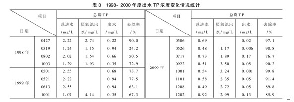 從表3可以看出,北廠進水TP一般在0•4~2•5 mg/L之間,隨著進水TP增大,出水TP濃度也相應(yīng)增大。但是由于總磷負(fù)荷率在0•002~0•003kgTP/(kgMLSS•d),因此總磷的去除率仍較高。
