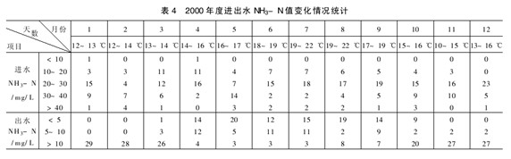 從表4可以看出,全年中各月的進水NH3-N變化不大,一般在20~30 mg/L。而出水NH3-N則不同。由于溫度的影響,一四季度(水溫12~16℃)出水NH3-N<5 mg/L的天數(shù)占運行天數(shù)的0~29%,NH3-N<10 mg/L的天數(shù)占運行天數(shù)的0~35%;二三季度(17~22℃)出水NH3-N<5mg/L的天數(shù)占運行天數(shù)的46%~71%,NH3-N<10 mg/L的天數(shù)占運行天數(shù)的72%~93%。