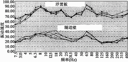 | 圖4 科隆地鐵浮置板及隧道壁垂向振動(dòng)速度(dB) 比較 |
