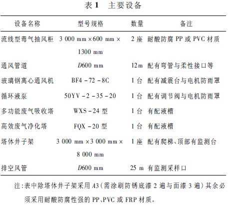 首先必須根據(jù)四只酸洗槽敞口面積,計算實際需要的NOx 廢氣排風量,以及整個通風管道、吸風罩、凈化塔的阻力損失,選用通風機的排風量和風壓損失。同時還應(yīng)考慮風量、風壓的附加安全系數(shù)[4]是設(shè)計通風凈化系統(tǒng)的重要技術(shù)指標。本系統(tǒng)處理 NOx 廢氣量為12 000m3 / h。該工程使用的主要設(shè)備見表1。
