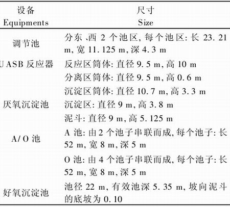 | 表1 UASB—A/O工藝流程中的主要設(shè)備尺寸 |