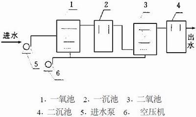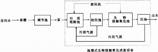 該廠原購置安裝的一套地埋式生物接觸氧化設(shè)備, 經(jīng)調(diào)試運行, 出水BOD5≥120 mg/L , 無法達到地方污水排放標(biāo)準(zhǔn). 原有工藝流程如附圖.