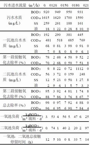 當(dāng)?shù)谝欢紊锝佑|氧化有機負(fù)荷為4. 56 kg2 BOD5 /m 3 填料·d 時, BOD5 從949 mg/L 降至290 mg/L , 去除率為69. 4% , CODcr從1 620mg/L 降至518 mg/L , 去除率為68. 0% , 再接第二段生物接觸氧化, 負(fù)荷為1. 40 kgBOD5 /m 3 填料·d, 則 BOD5 和CODcr分別降至2. 0mg/L 和72. 0mg/L , 去除率分別為92. 4%和86. 3% , 全過程BOD5 的去除率為97. 7% , CODcr的去除率為95. 6% , 出水全部指標(biāo)達到排放標(biāo)準(zhǔn)。有機負(fù)荷過大時, 出水難以保證達標(biāo); 有機負(fù)荷過小時, BOD5, CODcr的去除率雖有進一步提高, 但在工程設(shè)計中處理設(shè)施容積將大幅度增加, 是不經(jīng)濟的. 同時, 當(dāng)一氧池負(fù)荷為4. 56 kgBOD5 /m 3 填料·d 時, 一沉池出水BOD5 為 290mg/L , 能滿足工廠現(xiàn)有成套設(shè)備的原設(shè)計進水要求, 因此該組數(shù)據(jù)可以作為工程設(shè)計的依據(jù).