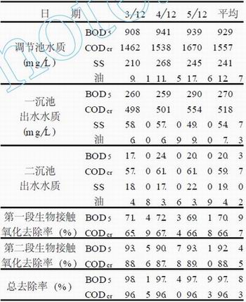 工程改造過程中, 原污水處理設(shè)備保持運轉(zhuǎn). 新增一氧池竣工后, 開始調(diào)試. 首先按照小試研究的方法, 在一氧池填料上掛膜馴化, 然后再將一氧池與原設(shè)施連通, 投入運轉(zhuǎn). 運轉(zhuǎn)2 個月后, 經(jīng)生物相觀察表明, 一氧池生物膜主要的菌膠團、絲狀菌、鐘蟲、枝蟲等原生動物, 二氧池生物膜出現(xiàn)輪蟲、線蟲等大量后生動物, 說明二段生物接觸氧化過程是正常的.表2 為正常運行后連續(xù)3 d 水質(zhì)監(jiān)測的結(jié)果.