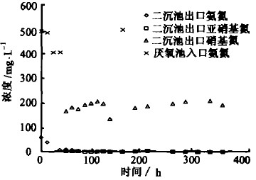 滲濾液氮氮的去除情況示見于圖3。由圖3可以看出,二沉池出口的氨氮和亞硝基氮始終維持在很低的水平。在開始連續(xù)運行的初期,二沉池出口氨氮濃度有一個急劇下降的趨勢,主要是由于在污泥馴化階段未進行連續(xù)運行,二沉池中的水為原來積存的水,連續(xù)運行后,其氨氮被從第2曝氣池中出來的水稀釋。考察運行初期第 2曝氣池出水的氨氮濃度,可以知道,其濃度幾乎為零。這表明,污泥中已經存在硝化菌,且已經適于處理滲濾液中的氨氮。