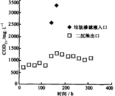 由于天氣逐漸變冷且雨水較少,滲濾液的產生量減少,濃度有所上升,基本上維持在3000mg/L左右。從這一段時間的運行結果來看,二沉池出口的CODcr逐漸上升至1000mg/L,之后基本穩(wěn)定在1000mg幾左右見圖4。