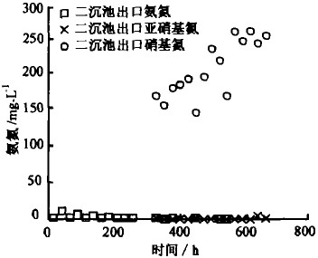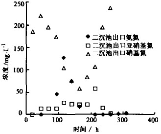 圖7顯示了二沉池出水中的氨氮、硝基氮和亞硝基氮的濃度變化情況。從圖上可以看出,出水中的氨氮、亞硝基氮的濃度均處于很低的水平,硝基氮則在200mg/L上下波動,其濃度主要受水中溶解氧濃度的影響。因此,控制生物處理裝置中的曝氣量是十分重要的。