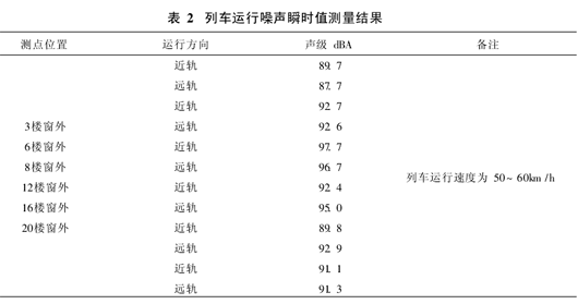 為了分析武漢市城市軌道交通噪聲環(huán)境影響的范圍和程度,對既有的城市高架軌道交通線進(jìn)行了噪聲測量,測量區(qū)段的橋高約8~10m,距橋梁中心線為20m處,列車運(yùn)行噪聲瞬時值測量結(jié)果見表2。