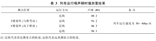 測量點距橋梁中心線為10m處,列車運(yùn)行噪聲瞬時值測量結(jié)果見表3,在測點與軌道之間設(shè)置了約4m高直立式隔聲屏。