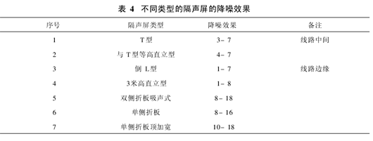 隔聲屏模型試驗共進(jìn)行了設(shè)置T型隔聲屏、直立式隔聲屏,倒L式隔聲屏、大型折板式隔聲屏等二十余種隔聲屏降噪效果模型試驗,根據(jù)試驗結(jié)果,城市軌道交通采用不同類型的隔聲屏的降噪效果詳見表4。