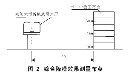 在設(shè)置了大型折板式隔聲屏的輕軌高架橋旁的市二中教工宿舍的1、3、5樓設(shè)置噪聲測量點,測量布點見圖2。