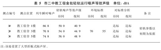 在測量現(xiàn)場發(fā)現(xiàn),輕軌列車的噪聲小于道路上公交車的噪聲,無法直接測量出輕軌運(yùn)行噪聲的等效聲級,為了排除背景噪聲的干擾,決定在各測量點同時測量列車通過時的瞬時噪聲,再根據(jù)輕軌的車流量、車速及列車通過時間計算出各測點的等效聲級。根據(jù)市二中教工宿舍處輕軌列車運(yùn)行瞬時噪聲的測量結(jié)果,結(jié)合武漢軌道交通的車長、車速、車流及運(yùn)行時間,測量的瞬時聲級及計算出的輕軌運(yùn)行噪聲等效聲級見表5。