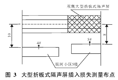在設(shè)置及不設(shè)置大型折板式隔聲屏的輕軌高架橋旁的銀河小區(qū)的5樓設(shè)置噪聲測量點,同時測量列車通過時的瞬時噪聲,得出在設(shè)置及不設(shè)置大型折板式隔聲屏?xí)r列車運(yùn)行瞬時噪聲的差值,由此得出大型折板式隔聲屏插入損失,測量布點見圖3。