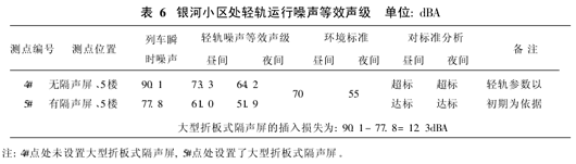 根據(jù)銀河小區(qū)處輕軌列車運(yùn)行瞬時噪聲的測量結(jié)果,結(jié)合軌道交通的車長、車速、車流及運(yùn)行時間,測量的瞬時聲級及計算出銀河小區(qū)的輕軌運(yùn)行噪聲等效聲級見表6。