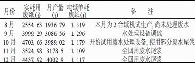 表4 回用廢水尾漿后噸成紙耗用廢紙統(tǒng)計表