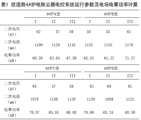 陽城國際發(fā)電有限責(zé)任公司總裝機(jī)容量為6×350MW。每臺(tái)爐配置了兩臺(tái)雙室三電場電除塵器,電除塵器本體采用山西電力環(huán)保廠的產(chǎn)品,電除塵器電氣控制系統(tǒng)采用浙江佳環(huán)電子有限公司的DJ-96型高壓電源控制裝置,額定電壓72kV、額定電流1200mA,正常運(yùn)行時(shí)二次電壓運(yùn)行在45~65kV,二次電流運(yùn)行在800~1200mA,工作方式為火花率整定。4#爐電除塵器電控系統(tǒng)改造前具體運(yùn)行參數(shù)和電暈功率見表1。