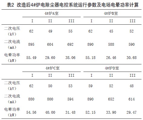 電除塵器改造后具體運(yùn)行參數(shù)和電場電暈功率見表 2。改造前電除塵器高壓電場總電暈功率為 803.03kW,改造后電除塵高壓電場總電暈功率為477.39kW,與改造前相比,改造后電暈功率降低325.64kW,降幅為4 0 . 5 5%,節(jié)能幅度十分顯著。用電除塵耗電量計(jì)量,取改造前后三天電量的平均值為參考,其中改造前平均耗電量為23,273kW• h/d,改造后平均耗電量為 13,836kW•h/d,以每臺(tái)機(jī)組利用天數(shù)為300天來計(jì)算,一年可節(jié)約電量2.83GW•h。以發(fā)電成本0.30元/kW•h估算,則改造后一臺(tái)爐的電除塵器一年可節(jié)省84.9萬元。這樣六臺(tái)爐一年可節(jié)省509.4萬元,本次六臺(tái)爐電除塵電控系統(tǒng)改造工程投資約170萬元,投資回收期不到一年,其經(jīng)濟(jì)效益十分可觀。