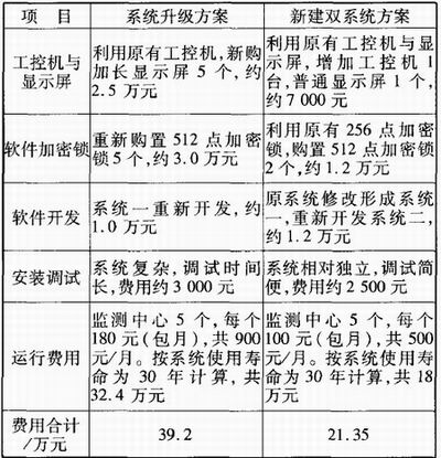 新系統(tǒng)的建立,充分考慮了原有設(shè)備的充分利用,只需新購(gòu)置一臺(tái)工控機(jī)作為系統(tǒng)二的硬件,對(duì)系 統(tǒng)GPRS卡的IP地址重新進(jìn)行設(shè)定,參照系統(tǒng)一進(jìn) 行系統(tǒng)二的新程序開發(fā),方便快捷。系統(tǒng)一的監(jiān)測(cè) 點(diǎn)數(shù)沒有增加,原256點(diǎn)組態(tài)王加密鎖可繼續(xù)使用。 為系統(tǒng)擴(kuò)容預(yù)留空問(wèn),系統(tǒng)二采用512點(diǎn)加密鎖。 兩種方案的投資對(duì)比分析見表1。