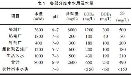 目前, 該工業(yè)園區(qū)內(nèi)已建成的企業(yè)有染料廠,熱電廠, 制鈉工廠, 氯化聚乙烯廠, 氯化異氰尿酸, 氯酸鈉廠等, 產(chǎn)業(yè)規(guī)劃中陸續(xù)建設(shè)的企業(yè)多以化工為主。生產(chǎn)廢水中含有焦油、酚類、氨氮等物質(zhì), 屬難于處理的廢水。上述工業(yè)廢水中, 氯酸鈉廠產(chǎn)生的廢水含鹽量較大, 廢水中含有強氧化劑如游離氯、次氯酸鈣、次氯酸鈉等, 若該部分廢水直接排入污水處理廠, 會對污水處理工藝尤其是生化反應(yīng)階段影響較大, 因此在設(shè)計中采用清污分流和輕重分流的原則, 將上述廢水單獨排入蒸發(fā)池內(nèi)處理。其他企業(yè)產(chǎn)生的污水進行預(yù)處理后排入污水處理廠。污水處理廠接納的排污企業(yè)有染料廠, 熱電廠, 制鈉廠, 氯化聚乙烯廠及部分生活污水。各部分廢水水質(zhì)及水量見表1。出水要求符合國家污水綜合排放標(biāo)準(zhǔn)(GB 8978-1996) 二級排放標(biāo)準(zhǔn)。