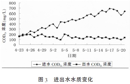 馴化開始時, 在SBR 池中分別注入2/3 池低濃度的熱電廠廢水, 其余為其他廢水, 進行連續(xù)鼓風(fēng)悶曝2d, 當(dāng)反應(yīng)池內(nèi)出現(xiàn)少量活性污泥絮狀物時, 即進入下一個周期運行。投入廢水占設(shè)計進水水量的比例由30%逐漸提高到100%, 使微生物緩慢適應(yīng)處理的水質(zhì)。經(jīng)過一個月時間, SBR 池內(nèi)污泥濃度應(yīng)增加到3000mg/L, 完成了活性污泥的培養(yǎng)。水解酸化池內(nèi)微生物生長較慢, 大約經(jīng)歷兩個月的時間, 培養(yǎng)細(xì)菌階段結(jié)束, 經(jīng)過生物鏡檢, SBR 內(nèi)可以明顯觀察到存在大量的原生動物。水解池內(nèi)填料表面也形成良好生物膜, 整個工程投入正式運行。圖3 為調(diào)試期間進出水水質(zhì)變化曲線。